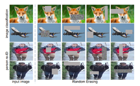 论文:Random erasing data augmentation 在训练中,随机擦除随机选择图像中的一个矩形区域, 通过随机擦除目标的特征模拟遮挡的效果,提高模型 的泛化能力,弱化模型对于目标全部特征的依赖。