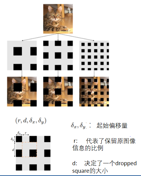不再通过随机位置确定patch的位置,而是将原图划分为若干份,然后对 划分的每一份依概率进行隐藏,并且每一张图片的隐藏区域都是随机的 例如,将224*224*3的图像划分为16份,每个patch为56*56*3,每个patch是否隐藏 的概率p=0.5.