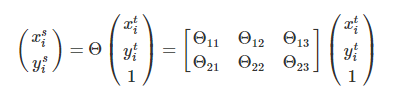 有了第一步的变化参数,这一步是做个矩阵运算,这个运算是以目标图V的所有坐标点为自变量,以Θ为参数做一个矩阵运算,得到输入图U的坐标点。