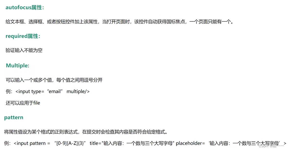 autofocus是聚焦的属性,作用上面图中有解释,只能一次用在一个标签身上;required属性是验证输入不能为空;pattern属性结合正则表达式,检查其内容是否符合给定的格式。
