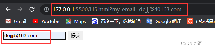 填入正确的邮箱格式,一定要加@,不然网页就会提示你邮箱格式不正确,填好了,点击提交,此时的网址就会加上你的邮箱信息,当然是必须要在input里写上name属性才可以。