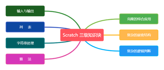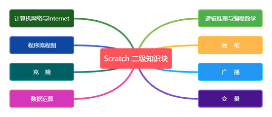 二级 | 计算机网络和 Internet 基本概念 流程图的概念与描述克隆画笔拓展模块数据运算广播变量 逻辑推理和编程数学(逻辑运算) | 理解编程相关抽象概念,具备一定的逻辑推理能力及基础设计能力,能够独立完成包含分支语句、循环语句等比较综合的案例。 |