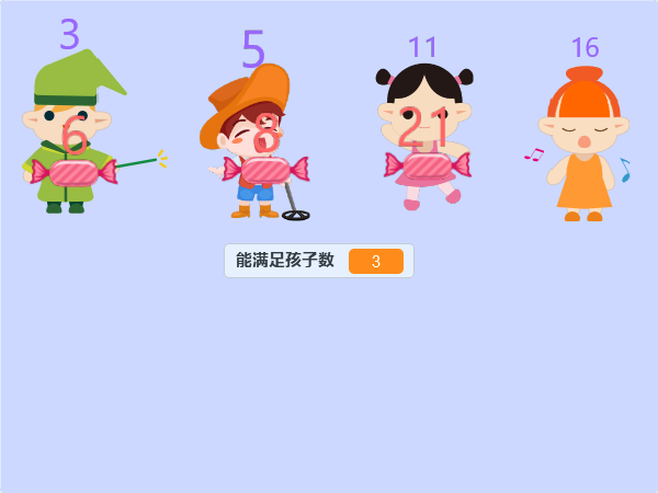 由此,因为糖果已经分完了,所以分糖果结束,我们的糖果能够满足3位小朋友的需求。