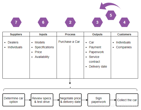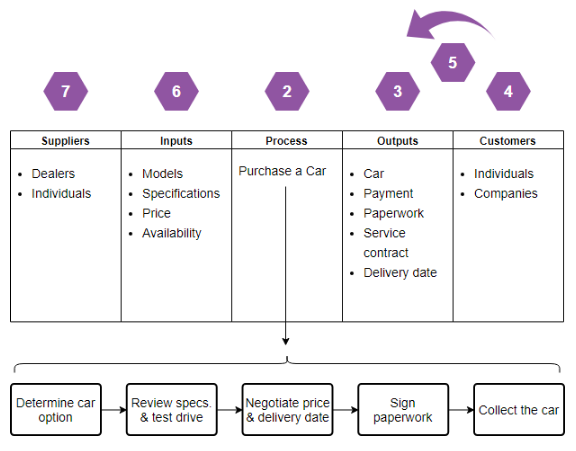 以下步驟描述瞭如何在“汽車購買過程”示例的背景下與您的團隊一起創建SIPOC地圖: