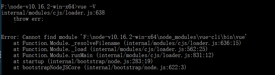 在nodejs的安装目录下vue命令出错,其他目录又正常internal/modules/cjs/loader.js:638 throw err; ^ Error: Cannot find modul