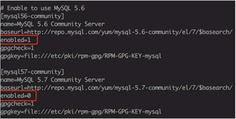 备注:enabled=1表示即将要安装的mysql版本,这个文件也可以不修改,默认安装mysql最高版本