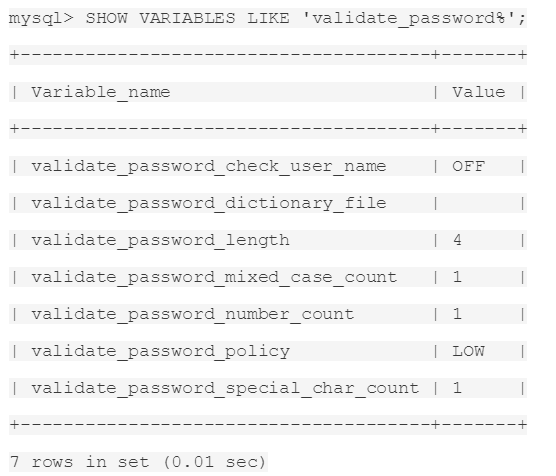 我的是已经修改过的,初始情况下第一个的值是ON,validate_password_length是8。可以通过如下命令修改: