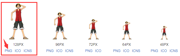 https://www.easyicon.net/581941-Lufy_cartoon_icon.html里面的图标,我们下载128*128点阵大小的PNG图片(下载的图片已经放在了本章教程配套例子的Doc文件夹里面):