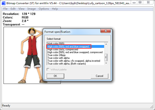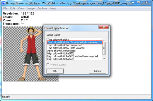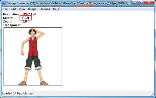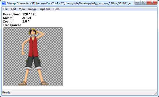 - 第1步:打开BmpCvtST.exe ,直接将PNG格式的图片拖到此软件里面即可,或者点击File->Open进行加载也是可以的。
