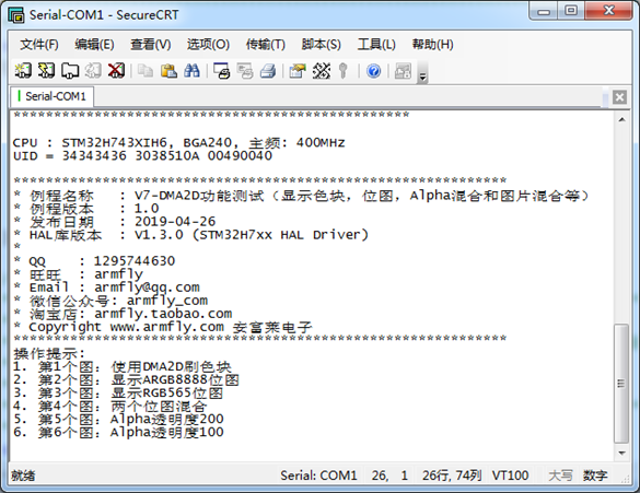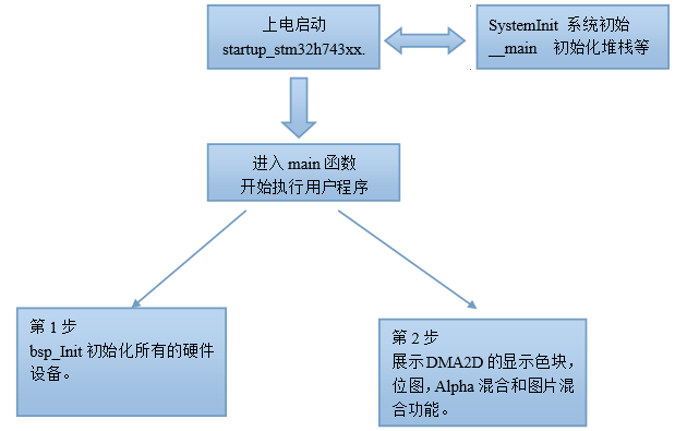 {uint16_t ucBright; /* 背光亮度(0-255) */FONT_T tFont; /* 定义一个字体结构体变量,用于设置字体参数 *//* 设置字体参数 */{tFont.FontCode = FC_ST_16; /* 字体代码 16点阵 */tFont.FrontColor = CL_WHITE; /* 字体颜色 */tFont.BackColor = CL_BLUE; /* 文字背景颜色 */tFont.Space = 0; /* 文字间距,单位 = 像素 */} bsp_Init(); /* 硬件初始化 */PrintfLogo(); /* 打印例程名称和版本等信息 */PrintfHelp(); /* 打印操作提示 *//* 延迟200ms再点亮背光,避免瞬间高亮 */bsp_DelayMS(200); LCD_ClrScr(CL_BLUE);/* 界面整体显示完毕后,再打开背光,设置为缺省亮度 */bsp_DelayMS(100); ucBright = BRIGHT_DEFAULT;LCD_SetBackLight(ucBright);/* 第1个图:使用DMA2D刷色块 ##############################################################*/LCD_DispStr(24, 2, "DMA2D刷色块", &tFont);_DMA2D_Fill((void *)(SDRAM_LCD_BUF1 + g_LcdWidth*20*2 + 24*2), /* 显示起始地址(24, 20) */ 128, /* 色块长 */ 128, /* 色块高 */g_LcdWidth-128, /* 色块行偏移 */CL_RED, /* 色块颜色 */LTDC_PIXEL_FORMAT_RGB565); /* 色块颜色格式 */ /* 第2个图:显示ARGB8888位图 ##############################################################*/LCD_DispStr(176, 2, "刷ARGB8888位图", &tFont);