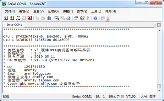 {int iTimeStart, iTimeEnd;FONT_T tFont; /* 定义一个字体结构体变量,用于设置字体参数 */char buf0[100];char buf1[100];/* 设置字体属性 */tFont.FontCode = FC_ST_16; /* 字体选择宋体16点阵,高16x宽15) */tFont.FrontColor = CL_RED; /* 字体颜色设置为红色 */tFont.BackColor = CL_MASK; /* 文字背景颜色,透明 */tFont.Space = 0; /* 字符水平间距, 单位 = 像素 *//* 第1步:JPEG初始化 ###########################################*/JPEG_Handle.Instance = JPEG;HAL_JPEG_Init(&JPEG_Handle); iTimeStart = bsp_GetRunTime();JPEG_Decode_DMA(&JPEG_Handle, (uint32_t)_ac1, sizeof(_ac1) , SDRAM_APP_BUF);/* 第2步:等待JPEG解码完成 ###########################################*/while(Jpeg_HWDecodingEnd == 0){} iTimeEnd = bsp_GetRunTime();sprintf(buf0, "STM32H7硬件JPEG解码480*272图片时间=%dms", iTimeEnd- iTimeStart); /* 第3步:获取JPEG图片信息###########################################*/ HAL_JPEG_GetInfo(&JPEG_Handle, &JPEG_Info); /* 第4步:绘制JPEG图片到显示屏###########################################*/ iTimeStart = bsp_GetRunTime();DMA2D_Copy_YCbCr_To_RGB((uint32_t *)SDRAM_APP_BUF, /* JEPG解码后的数据 */(uint32_t *)SDRAM_LCD_BUF1, /* 这里是显存地址 */0 , 0, JPEG_Info.ImageWidth, JPEG_Info.ImageHeight, LTDC_PIXEL_FORMAT_RGB565,JPEG_Info.ChromaSubsampling);iTimeEnd = bsp_GetRunTime();LCD_DispStr(0, 0, buf0, &tFont);sprintf(buf1, "STM32H7硬件JPEG显示480*272图片时间=%dms", iTimeEnd- iTimeStart);LCD_DispStr(0, 18, buf1, &tFont); bsp_StartAutoTimer(0, 200); /* 启动1个200ms的自动重装的定时器,软件定时器0 *//* 进入主程序循环体 */while (1){bsp_Idle();/* 判断软件定时器0是否超时 */if(bsp_CheckTimer(0)){/* 每隔200ms 进来一次 */ bsp_LedToggle(2);}}
