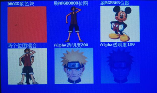 _DMA2D_DrawAlphaBitmap((void *)(SDRAM_LCD_BUF1 + g_LcdWidth*20*2 + 176*2), /* 显示起始地址(176, 20) */ (void *)_aclufei, /* 位图地址 */128, /* 位图长 */128, /* 位图高 */0, /* 位图行偏移 */g_LcdWidth-128, /* 目标区行偏移 */LTDC_PIXEL_FORMAT_RGB565); /* 目标区颜色格式 *//* 第3个图:显示RGB565位图 ##############################################################*/LCD_DispStr(328, 2, "刷RGB565位图", &tFont);_DMA2D_Copy((uint32_t *)_acmickey, /* 位图地址 */(uint32_t *)(SDRAM_LCD_BUF1 + g_LcdWidth*20*2 + 328*2), /* 显示起始地址(328, 20) */ 128, /* 位图长 */128, /* 位图高 */0, /* 位图行偏移 */g_LcdWidth-128, /* 目标区行偏移 */LTDC_PIXEL_FORMAT_RGB565); /* 目标区颜色格式 *//* 第4个图:两个位图混合 ##############################################################*/LCD_DispStr(24, 150, "两个位图混合", &tFont); _DMA2D_AlphaBlendingBulk((uint32_t *)_aclufei, /* 前景层位图地址 */0, /* 前景层行偏移 */ (uint32_t *)_acsuolong, /* 背景层位图地址 */ 0, /* 背景层行偏移 */ (uint32_t *)(SDRAM_LCD_BUF1 + g_LcdWidth*168*2 + 24*2), /* 显示起始地址(24, 168) */ g_LcdWidth-128, /* 目标区行偏移 */128, /* 目标区长 */128); /* 目标区高 *//* 第5个图:Alpha透明度200的位图显示 #######################################################*/LCD_DispStr(176, 150, "Alpha透明度200", &tFont);_DMA2D_MixColorsBulk((uint32_t *)_achuoying, /* 位图地址 */0, /* 位图行偏移 */ (uint32_t *)(SDRAM_LCD_BUF1 + g_LcdWidth*168*2 + 176*2), /* 显示起始地址(176, 168) */g_LcdWidth-128, /* 目标区行偏移 */ 128, /* 目标区长 */128, /* 目标区高 */ 200); /* 位图显示透明度200 *//* 第6个图:Alpha透明度100的位图显示 ####################################################*/LCD_DispStr(328, 150, "Alpha透明度100", &tFont);_DMA2D_MixColorsBulk((uint32_t *)_achuoying, /* 位图地址 */0, /* 位图行偏移 */ (uint32_t *)(SDRAM_LCD_BUF1 + g_LcdWidth*168*2 + 328*2), /* 显示起始地址(328, 168) */g_LcdWidth-128, /* 目标区行偏移 */ 128, /* 目标区长 */128, /* 目标区高 */ 100); /* 位图显示透明度200 */ bsp_StartAutoTimer(0, 200); /* 启动1个200ms的自动重装的定时器,软件定时器0 */while (1){bsp_Idle();/* 判断软件定时器0是否超时 */if(bsp_CheckTimer(0)){/* 每隔200ms 进来一次 */ bsp_LedToggle(2);}}