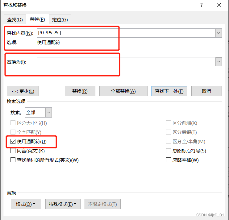 - 查找内容使用正则表达式。其中 “!”代表非、排除,“-”和“.”分别为负数符合和小数点,“&”代表与、和,“[ ]”必不可少。如数字仅有0-9,则查找内容可以修改为“[!0-9]”。