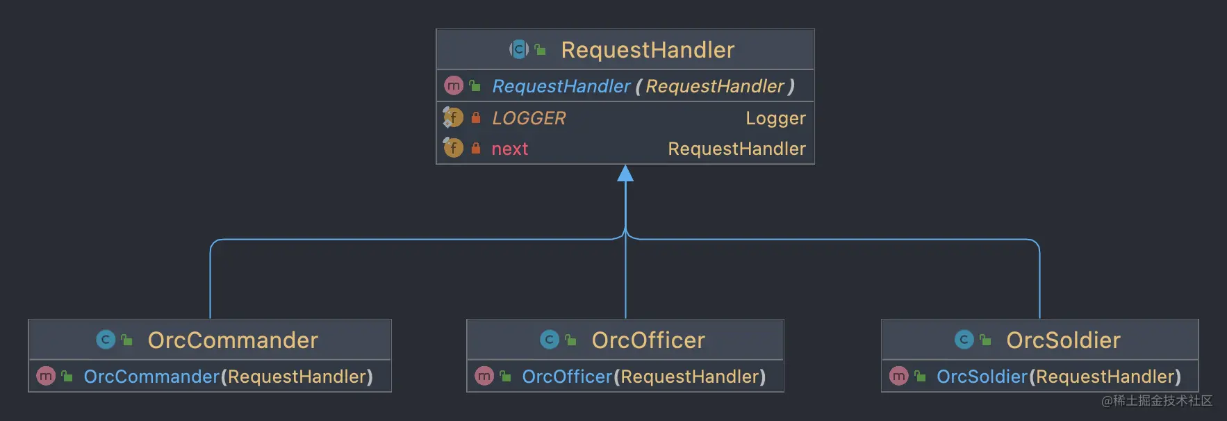 public class King {private RequestHandler chain;public King() {buildChain();}private void buildChain() {chain = new Commander(new Officer(new Soldier(null)));}public void makeRequest(Request req) {chain.handleRequest(req);}}