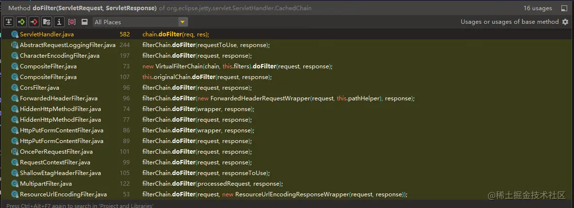 通过分析ServletHandler中doFilter方法的引用可以看出,doFilter被不同的Handler实现.