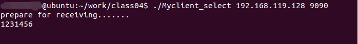 {int sockfd;struct sockaddr_in My_clientaddr;socklen_t len = sizeof(struct sockaddr_in);char buf[MAXBUF + 1];int retval,maxfd;fd_set rfds;struct timeval tv;if((sockfd = socket(AF_INET,SOCK_STREAM,0)) == -1){perror("socket error!\n");return 1;}My_clientaddr.sin_family = AF_INET;My_clientaddr.sin_port = htons(atoi(argv[2]));if(argv[1])My_clientaddr.sin_addr.s_addr = inet_addr(argv[1]);elseMy_clientaddr.sin_addr.s_addr = INADDR_ANY;if(connect(sockfd,(struct sockaddr *)&My_clientaddr,sizeof(My_clientaddr)) != 0){perror("connect error\n");return 1;}printf("prepare for receiving.......\n");while (1){//每一次循环将rfds数组整体清0;FD_ZERO(&rfds);FD_SET(0,&rfds);FD_SET(sockfd,&rfds);maxfd = sockfd;tv.tv_sec = 100;tv.tv_usec = 0;retval = select(maxfd + 1,&rfds,NULL,NULL,&tv);if(retval == -1){perror("select error!\n");return 1;}else if(retval == 0) continue;else {if(FD_ISSET(0,&rfds))//如果是标准输入返回{memset(buf, 0 ,MAXBUF + 1);fgets(buf,MAXBUF,stdin);if(!strncasecmp(buf,"quit",4))//判断输入是否为quit(不分大小写){printf("will quit\n") ;break;//该break仅退出select机制内循环,链接并未结束}len = send(sockfd,buf,strlen(buf) - 1,0);//将输入的发给用户端if(len < 0){printf("send error\n");break;}}if(FD_ISSET(sockfd,&rfds))//判断客户端是否发送消息来{memset(buf, 0 ,MAXBUF + 1);len = recv(sockfd,buf,MAXBUF,0);if(len < 0){printf("recv error\n");break;}else{printf("receive from client message is :%s,byte:%d",buf,len);}}}}close(sockfd);return 0;