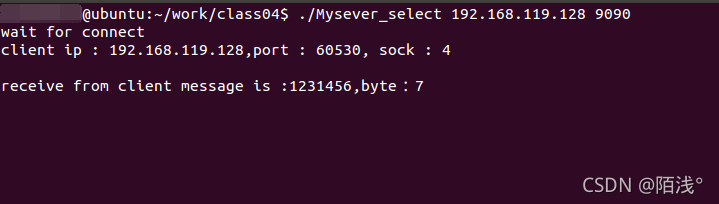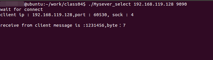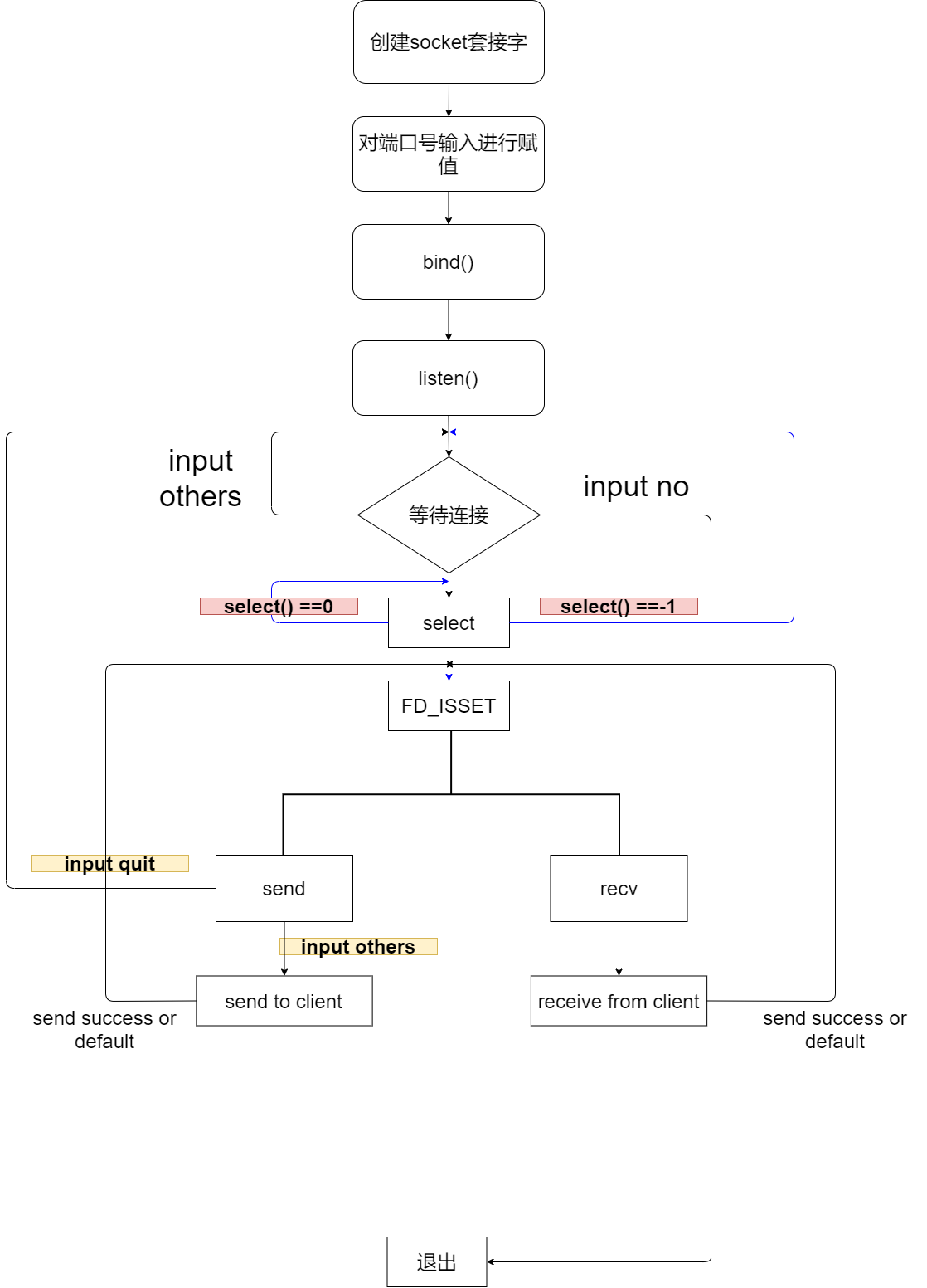 int main(int argc,char* argv[]){int sockfd;//用来表示socket句柄int new_fd;//用来表示客户端连接进来后的句柄struct sockaddr_in my_addr,client_addr;//分别为服务端和客户端的操作socklen_t len = sizeof(struct sockaddr_in); //存储(struct sockaddr_in )的内存大小unsigned int myport,lisnum;//设置端口号和监听的个数char buf[MAXBUF + 1];int retval,maxfd;//select 机制fd_set rfds; //fd_set本质为一个 long 类型的数组 8 * 128 = 1024/*目的:将每个位置表示为0,将对应操作位置改成1*/struct timeval tv;//超时时间if((sockfd = socket(AF_INET,SOCK_STREAM,0)) == -1){perror("socket error\n");return 1;}// argv[1]给ip地址,argv[2]给端口号if(argv[2]){myport = atoi(argv[2]);}else{myport = 7838;}if(argv[3]){lisnum = atoi(argv[3]);}else{lisnum = 2;}my_addr.sin_family = AF_INET;my_addr.sin_port = htons(myport);if(argv[1])my_addr.sin_addr.s_addr = inet_addr(argv[1]);elsemy_addr.sin_addr.s_addr = INADDR_ANY;if((bind(sockfd,(struct sockaddr*)&my_addr,len)) == -1){perror("bind error!\n");return 1;}if(listen(sockfd,lisnum) == -1){perror("listen error!\n");return 1;}/*以上前期服务端的准备工作完成,等待客户链接*/while (1){printf("wait for connect\n");if((new_fd = accept(sockfd,(struct sockaddr*)&client_addr,&len)) == -1){perror("accept error!\n");return 1;}else{printf("client ip : %s,port : %d, sock : %d\n",inet_ntoa(client_addr.sin_addr),ntohs(client_addr.sin_port),new_fd);}//以上为阻塞,等待客户端发信息给服务端while (1){//每一次循环将rfds数组整体清0;FD_ZERO(&rfds);FD_SET(0,&rfds);FD_SET(new_fd,&rfds);maxfd = new_fd;tv.tv_sec = 100;tv.tv_usec = 0;retval = select(maxfd + 1,&rfds,NULL,NULL,&tv);if(retval == -1){perror("select error!\n");return 1;}else if(retval == 0) continue;else {if(FD_ISSET(0,&rfds))//如果是标准输入返回{memset(buf, 0 ,MAXBUF + 1);fgets(buf,MAXBUF,stdin);if(!strncasecmp(buf,"quit",4))//判断输入是否为quit(不分大小写){printf("will quit\n") ;break;//该break仅退出select机制内循环,链接并未结束}len = send(new_fd,buf,strlen(buf) - 1,0);//将输入的发给用户端if(len < 0){printf("send error\n");break;}}if(FD_ISSET(new_fd,&rfds))//判断客户端是否发送消息来{memset(buf, 0 ,MAXBUF + 1);len = recv(new_fd,buf,MAXBUF,0);if(len < 0){printf("recv error\n");break;}else{printf("receive from client message is :%s,byte:%d",buf,len);}}}}close(new_fd);printf("need other connect (no->quit)");fflush(stdout);memset(buf,0,MAXBUF + 1);fgets(buf,MAXBUF,stdin);if(!strncasecmp(buf,"no",2)){printf("quit\n");break;}}close(sockfd);return 0;