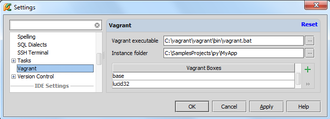 在设置对话框中(单击主工具栏的设置按钮),单击 Vagrant界面,然后输入可执行文件路径以及实例路径。