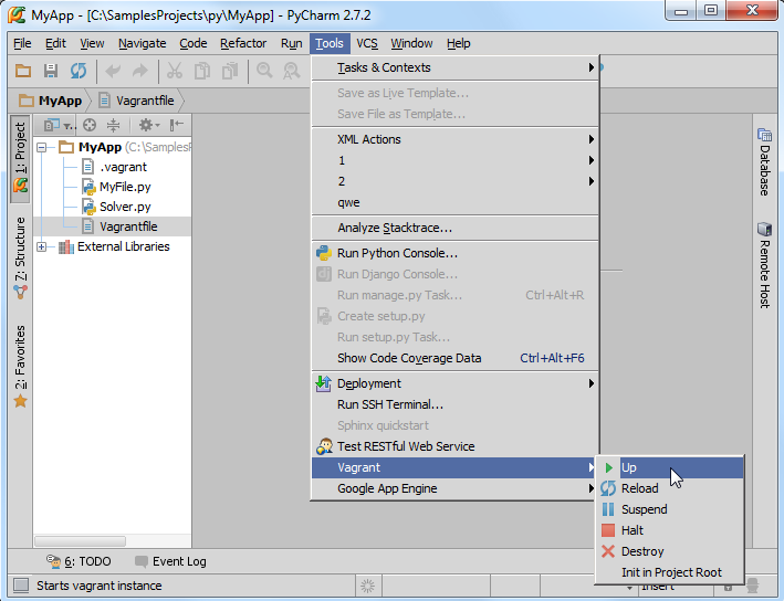 至此你已经新建了一个virtual box并已经将其添加到了当前环境中。注意Tool 菜单下的Vagrant 命令,这个命令与标准的Vagrant行为相关联。一旦创建了Vagrant box,就需要在工程存根下对其进行初始化。在主菜单上单击Tools | Vagrant,选择 Init in Project Root: