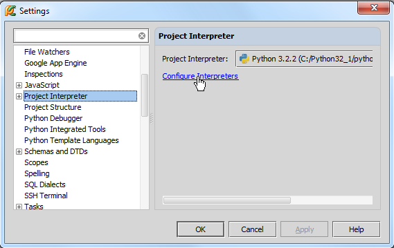 再次打开设置对话框(单击主工具栏上的设置按钮),选择Project Interpreter页面,在这里你可以从下拉列表中选择一个对应的解释器,但是如果当前没有可用的解释器,我们就需要单击Configure Interpreters来自定义一个: