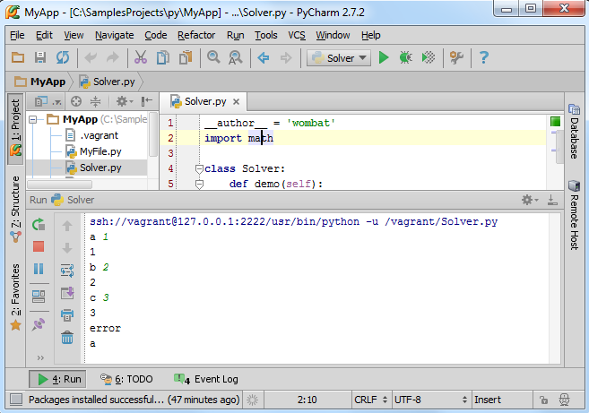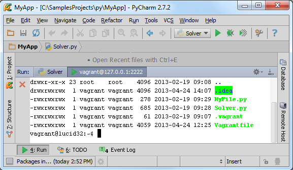Pycharm会自动运行vagrant up 命令,并在控制台界面显示输出结果: