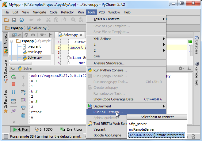 在主菜单中选择Tools | Run SSH Terminal,如果你定义了不止一个主机(host),则选择一个你想要建立链接的(我们这里选择远程解释器):