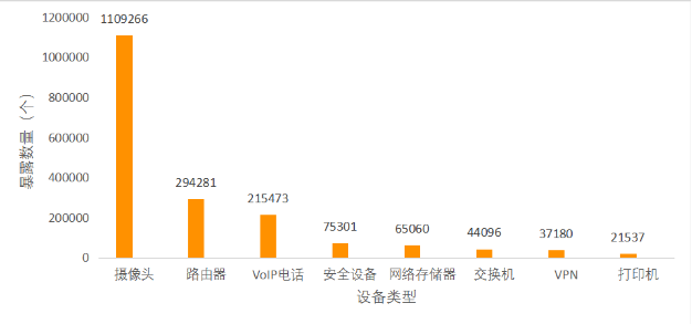 资产暴露情况分析考虑到网络地址变化因素 [7],为保证资产的准确性,所以我们对 2020 年 11 月的国内全部网段测绘 一轮作为今年的资产暴露情况展示数据。结合前述新发现的物联网资产指纹,共发现 186 万个物联网 资产,具体的设备类型分布情况如图 2.4。其中,摄像头、路由器、VoIP电话数量分别位列前三,这和 往年的分布是一样的,但是新增了安全设备和网络存储器;网络安全设备主要是指防火墙、WAF等安 全产品;网络存储器(NAS)是一种专用数据存储服务器,将存储设备与服务器彻底分离,集中管理数 据,从而释放带宽,降低成本。近年来,国内的 NAS服务器遭勒索病毒攻击事件频发,暴露互联网上 的存储设备,更应该保障其安全性。