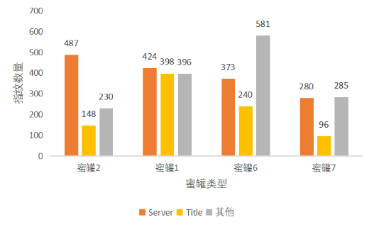 对物联网蜜罐的 HTML页面含有的物联网指纹类型进行统计,具体分布情况如图 2.9 。访问正常的 设备,Server 字段在 HTTP协议的头部,不会出现在页面中。此外,HTML页面同样不会有多个 Title类型, 所以通过这两个字段在 Banner 中出现的次数,可以用来识别某个 IP 是否为蜜罐。