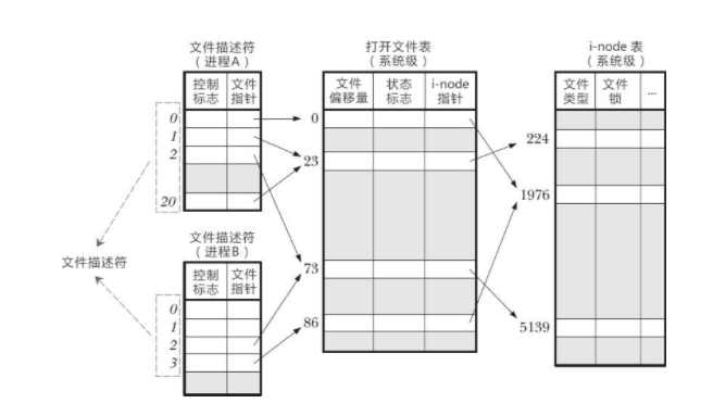 Linux 为每个进程创建了文件描述符表(fd, 文件指针),其中文件指针,指向了系统级的打开文件表,通过该指针可以获取到文件偏移量和i-node指针信息,再通过文件偏移量和i-node指针,可以定位到文件系统中的i-node表,从而找到物理硬盘上的文件。换言之,在操作系统之上,通过进程号和文件描述符就可以定位到具体的文件。这个关系是一对多的,因为一个对象可以被多个指针指向,而一个指针只能指向一个对象。这就意味着,多个进程级的文件描述符可能会指向同一个系统级打开文件表,多个打开文件表项可能指向同一个i-node表。