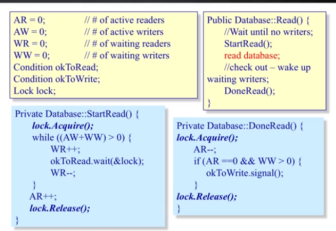 2)保证了不存在写线程,那么就进入临界区,AR ++ ,读共享资源。没有给read database 加锁,意味着所有的读线程都可以同时处于临界区中。