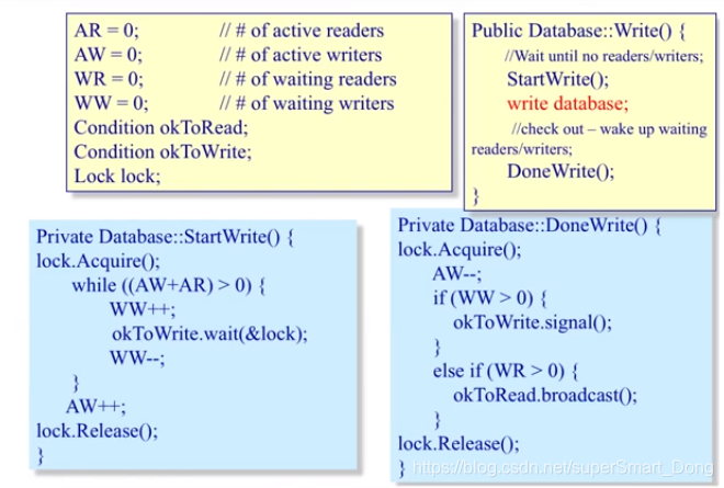 我们也理一理写者优先的互斥关系。上述的读者优先用信号量的方式实现。那么这次写着优先,打算用Hansen Style管程的方式实现。
