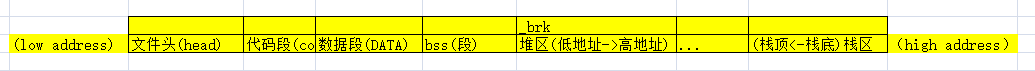 一个 .out 的文件执行映像如下图,符号 “_brk”表示bss段的结束,机器加载文件通常从文件头开始加载,加载到bss段 _brk标志结束。