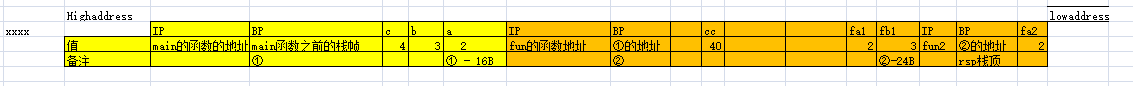 当执行到fun2 结束前:其栈内情况大致如下图所示