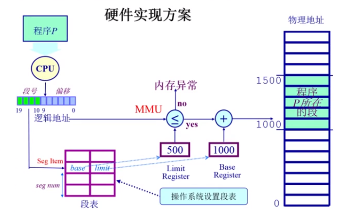 分段寻址方法即根据逻辑地址空间映射到物理地址空间。将单位逻辑地址分成两部分,第一部分是段号,第二部分是段内的偏移。 段号可在段表里找到物理内存中对应的起始地址,然后在这起始地址上加上段偏移量,得到程序的内存空间起始位置。在段表里除了物理内存对应的起始地址还包含该段的最大长度限制信息,如果访问越界则访问非法(段错误异常)