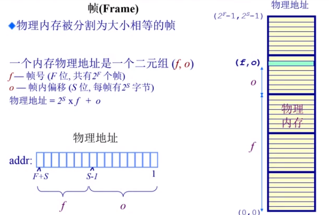 页帧是一种物理内存的组织和布局方式,页是逻辑地址的寻址方式。页帧也有页帧号和镇内偏移,物理地址也就可以得出来。例如在一个16bit的地址空间其中9bit是页帧偏移,剩下7bit表示页帧号当物理地址二元组表示是(3,6)对应的地址是1542