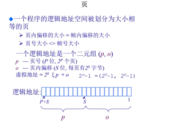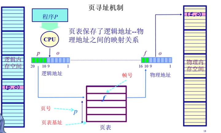 (逻辑)页映射到(物理)页帧,页是连续的虚拟内存而页帧是非连续的虚拟内存,由助于减小内存碎片的产生,并不是所有的页都有对应的帧,逻辑地址要步物理内存地址来的多,有些逻辑地址的页号并不能在页表中找到对应的帧号。通常只需要从逻辑地址的页号在页表上查询到帧号,得到帧号。又因为页号偏移的大小和页帧偏移的大小也是一致。从而得到物理内存的空间。