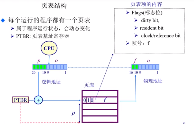 页表数据结构,就相当于一个大数组,页号就相当于数组的索引,这个大数组里面存放的就是帧号。通过逻辑页号算出索引值从而得到帧号,外加上逻辑偏移地址就可以找到物理地址。其中标志位中resident表示该页号是否存在,如果是0则表示没有可映射的物理内存页号。页表的建立是由操作系统来完成的,页表也是需要占用内存空间的。