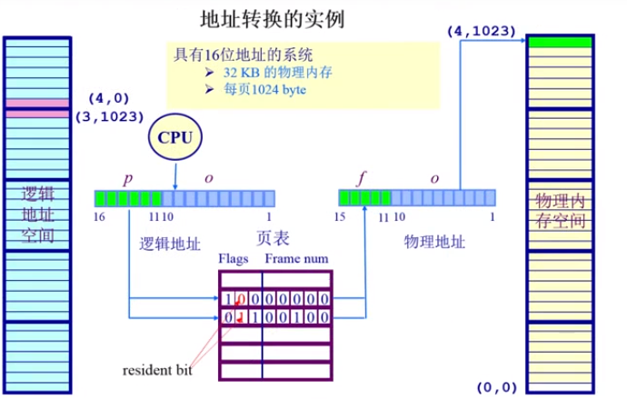 例如:逻辑地址空间有16bit ,意味者2^16 B = 64K的逻辑地址空间,但是物理空间只有32K,页大小1k。逻辑页有由元式表示 (4,0),说明页号是4,偏移量是 0,经过PTBR运算得到在页表中flags=100 , resident位是0,则表示该页号没有可对应的物理内存,得到一个内存访问异常。