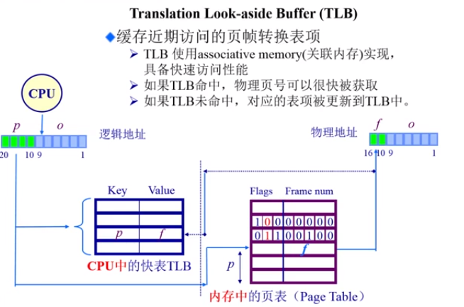 CPU的块表(TLB),把经常访问的页号存到TLB,如果命中则直接在CPU中取,如果没命中再到内存页表中取,取完后更新块表。注意这个取TLB的过程是由CPU完成,而TLB未命中后的操作由操作系统完成。