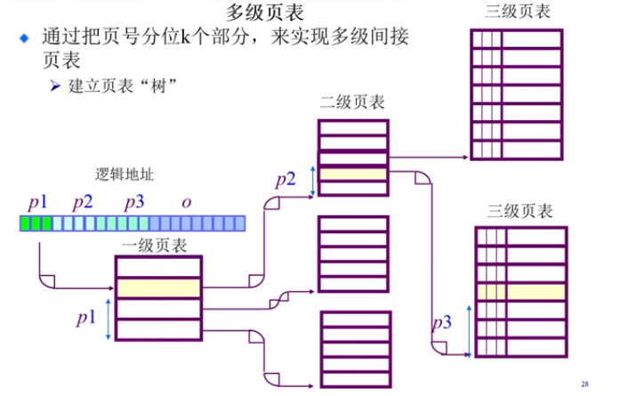 一般的计算机很难完成用单个页表的完成映射,可以用多级页表完成。即只有最后一级的页表项存的是页帧,而第一级开始当作页表的索引,页表项存的是下级页表的起始地址。当然resident标志在索引层页表是可以省略的。虽然页表增多,但是到最后的偏移量是不变的。多级页表在相同的内存空间下增加了多层级的访问映射,层级虽多,但是页表总大小要比单一页表大小来的少得多,当然访问时间的开销就会变得大。