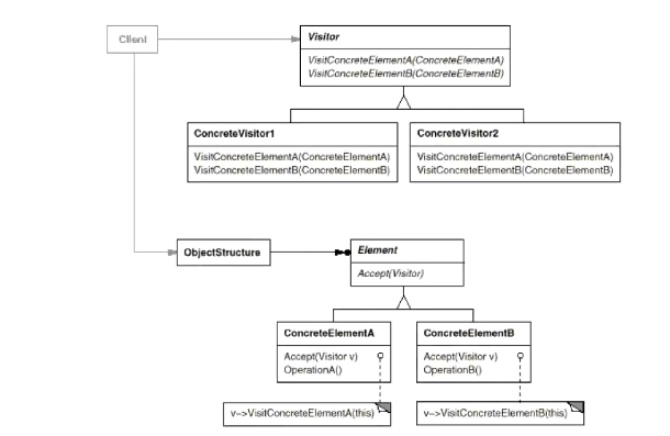 在软件构建过程中,由于需求的改变,某些类层次结构中需要增加新的行为,如果这些操作在基类中进行更改,那么派生类也要做出响应的变更,给变更工作带来繁重的负担。访问器模式,就是把原来基类和派生类的实现放在访问器类中,各个派生类访问这些访问器的操作方法。而访问器中的操作方法接受派生类的实体,对派生类的属性进行操作。这样要变更操作方法只需要变更具体的访问器,而不需要变更基类和派生类。