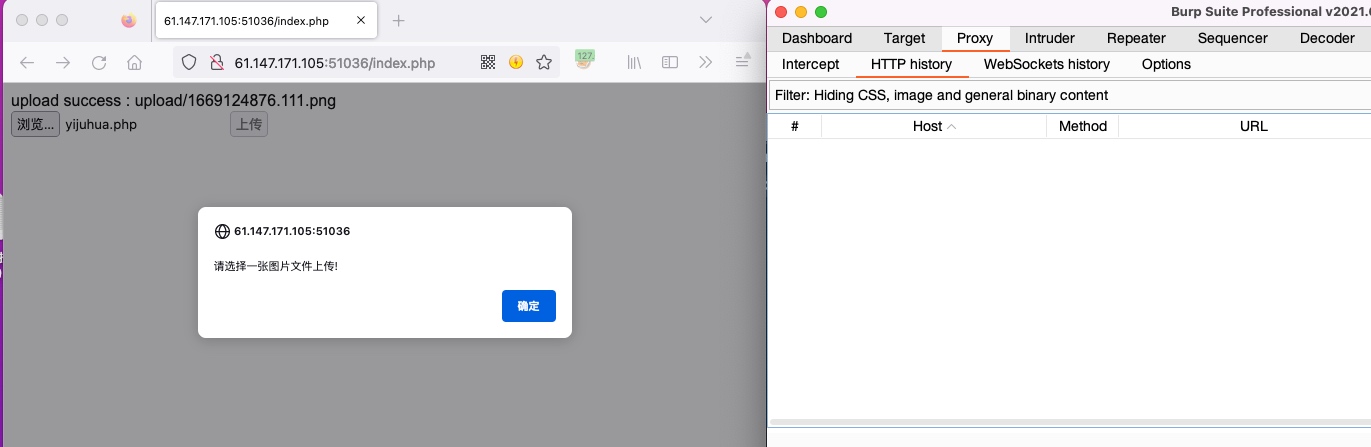 打开burp后,抓包,发现php依然无法从浏览器发送到burp上,说明是前端校验,直接改写文件格式即可。