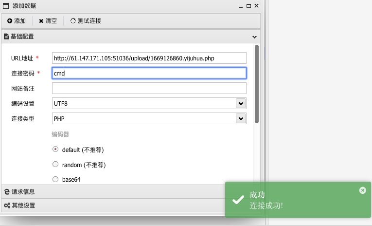 测试下连接,发现成功,直接连接,getshell。