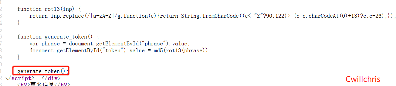 //id为phrase就是input输入框中的值,将该值md5加密后,作为token进行验证var phrase = document.getElementById("phrase").value;document.getElementById("token").value = md5(rot13(phrase));}generate_token();