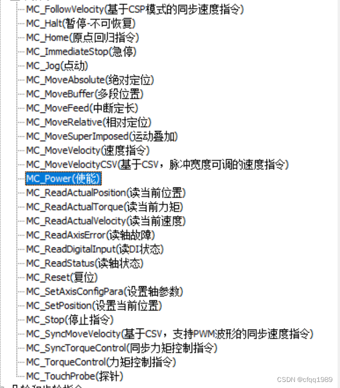 // MC_Halt_CO 暂停 【// MC_Home_CO 回原点 【// MC_Jog_CO 点动 【// MC_MoveAbsolute_CO 绝对运动 【// MC_MoveRelative_CO 相对运动 【// MC_MoveVelocity_CO 速度模式运行 【// MC_Power_CO 使能 【// MC_ReadParameter_CO 读取轴参数 【// MC_ReadStatus_CO 读取运动状态 【// MC_Reset_CO 运动状态复位 【// MC_SetOpMode_CO 设置工作模式 【// MC_Stop_CO 停止运动 【// MC_WriteParameter_CO 写轴参数 【