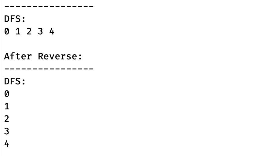 可以看到,在反转前的DFS能够按0->1->2->3->4的方式访问到链表,反转后,由于0->1的边被反转,不存在有效的边,所以只能以0-4为根生成多个连通子图。可见,我们真的实现了图的转置。