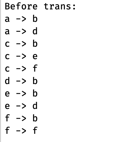 void Traverse(Graph graph){int size = graph->ver;for(int i=0;iEdge[i][j].weight!=0){printf("%c -> %c\n",graph->Vertex.info[i],graph->Vertex.info[j]);}}}