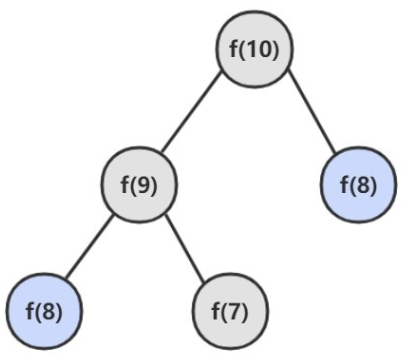 如果使用递归求解,会重复计算一些子问题。例如,计算 f(10) 需要计算 f(9) 和f(8),计算 f(9) 需要计算 f(8) 和 f(7),可以看到 f(8) 被重复计算了。