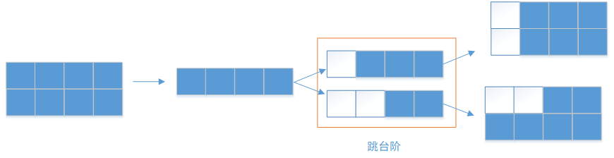 将2*n这个大矩形,看成一个n个矩形线性排列,然后一次可以用一个小1*1的矩形覆盖(即:2*1的矩形竖着),也可以用2*1的矩形覆盖(2*1的矩形横着)。这就和跳台阶一样。如图所示: