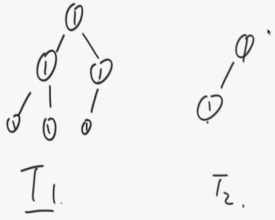 子树:从一个头结点开始,底下的东西全得要。此图返回true。T1的右子树和T2相同。